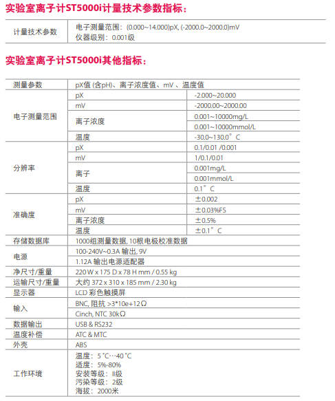 ST5000i卓越性能:存储1000条测量数据,内置13种离子类型,存储10根电极的最后一次校准数据,10根电极可命名、配置方法,3个终点方式和GLP模式
